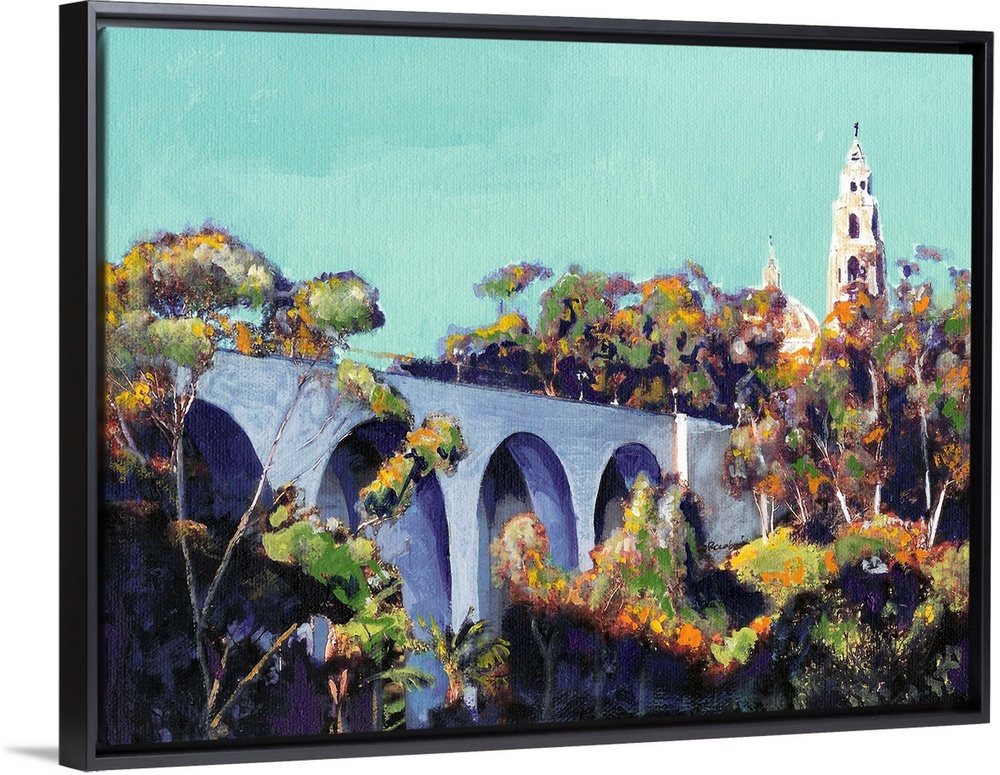 <p>Cabrillo Bridge Balboa Park San Diego painting by RD Riccoboni. The California Building is seen above the tree tops. Historic Balboa Park Bridge makes the grand entrance into of America's crown Jewels. The seven-arched, cantilevered Cabrillo Bridge is the first of its kind in California. In form, if not construction, it may have been inspired by a historic Roman bridge or Spanish viaduct. Frank P. Allen, Jr., the 1915 Exposition's director of works, and Thomas B. Hunter, a San Francisco engineer, designed the scenic bridge. Built mostly by hand by intrepid workers on scaffolding, the bridge has hollow "legs" reinforced with steel and resting on concrete caissons. It was recently retrofitted to meet today's seismic standards.</p>