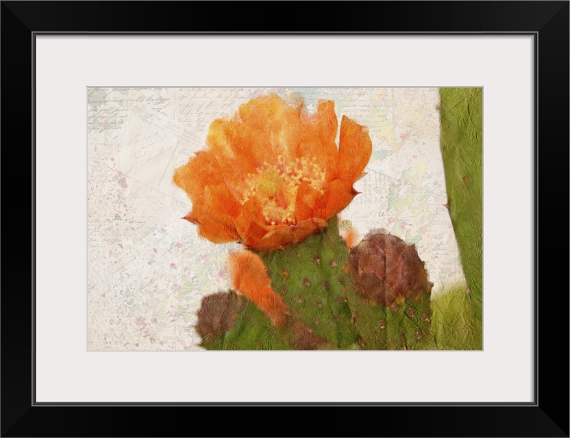<p>A watercolor painting of an orange cactus flower on a collage of handwritten postcards and colorful paint splatter.</p>