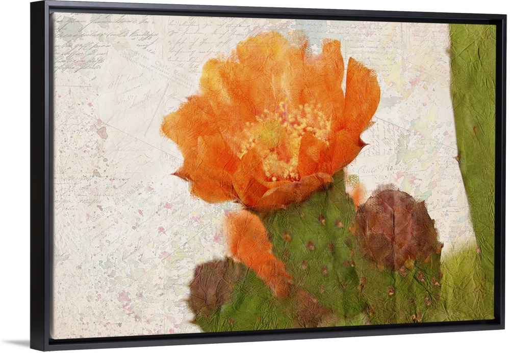 <p>A watercolor painting of an orange cactus flower on a collage of handwritten postcards and colorful paint splatter.</p>