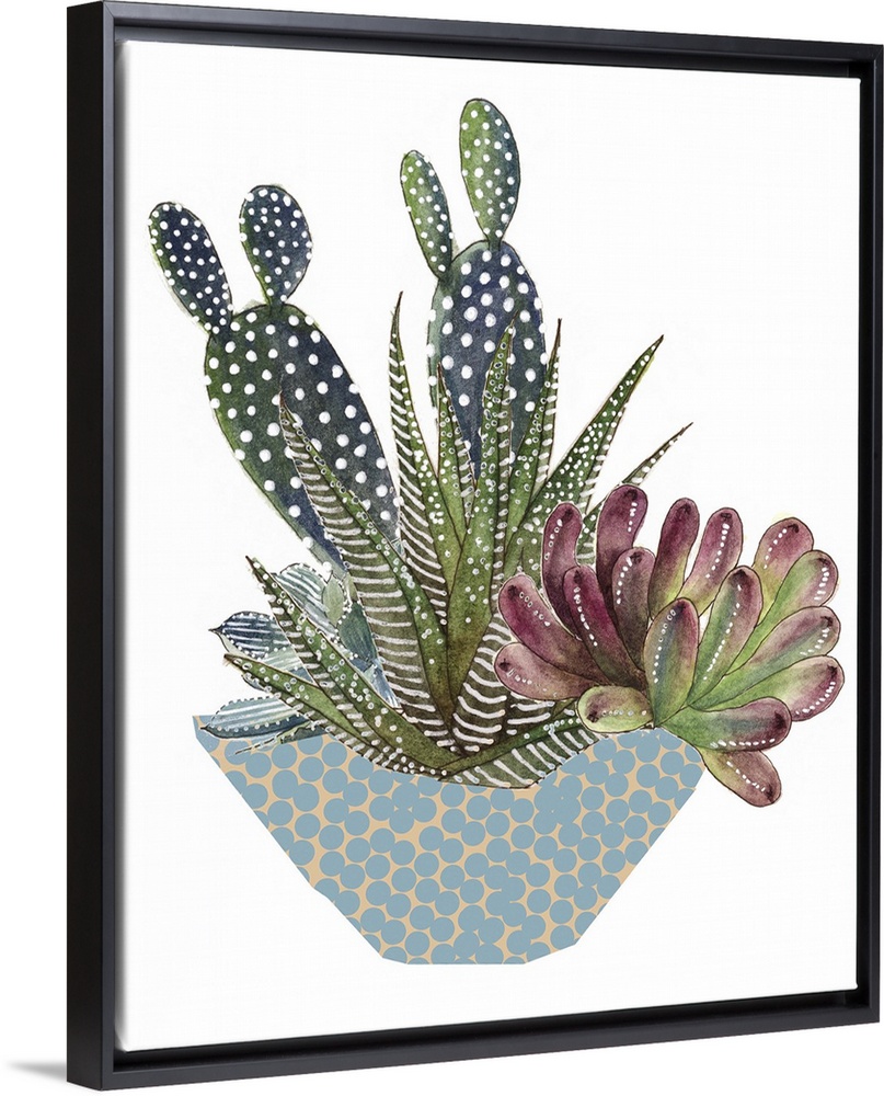 <p>Illustration of an arrangement of cactus and succulent plants in a dotted bowl.</p>