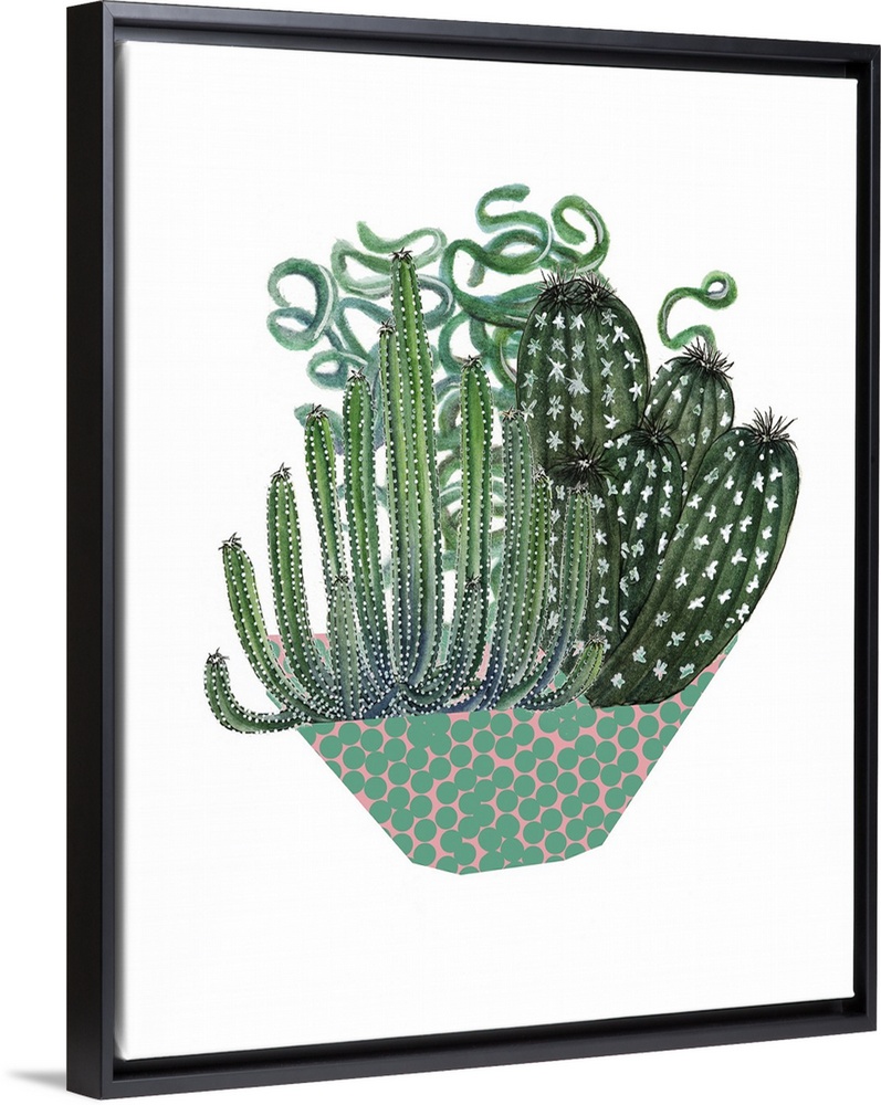 <p>Illustration of an arrangement of cactus and succulent plants in a dotted bowl.</p>