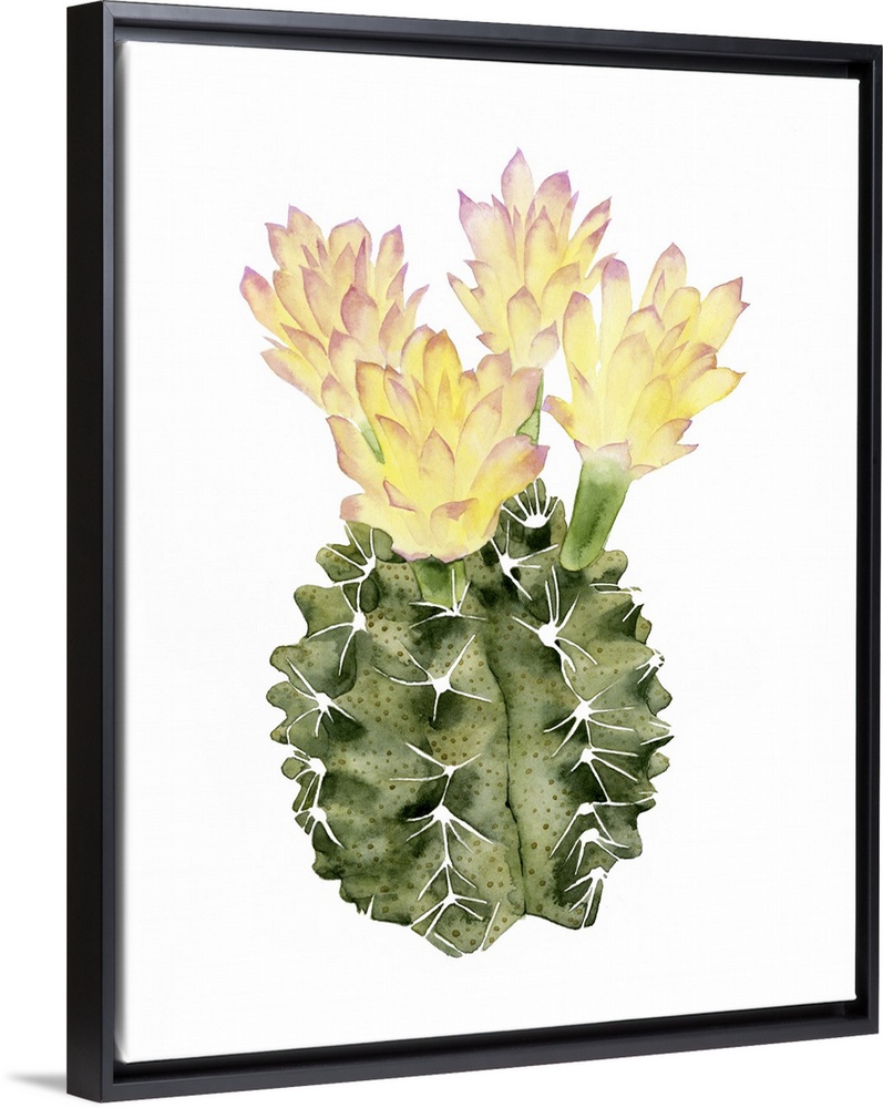 <p>Watercolor painting of a round cactus with blooming yellow flowers.</p>