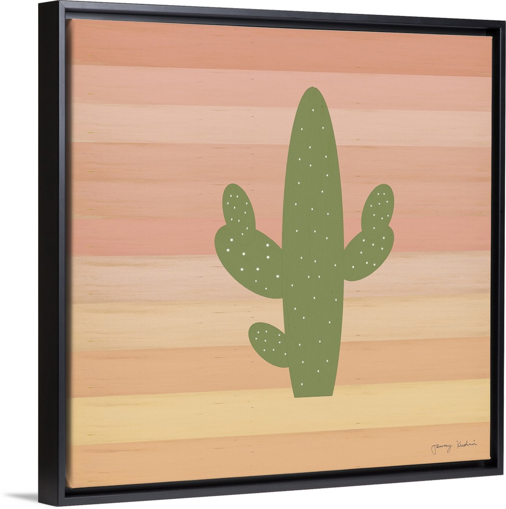 <p>Square decorative design of a green cactus on a striped background of shades of pink.</p>