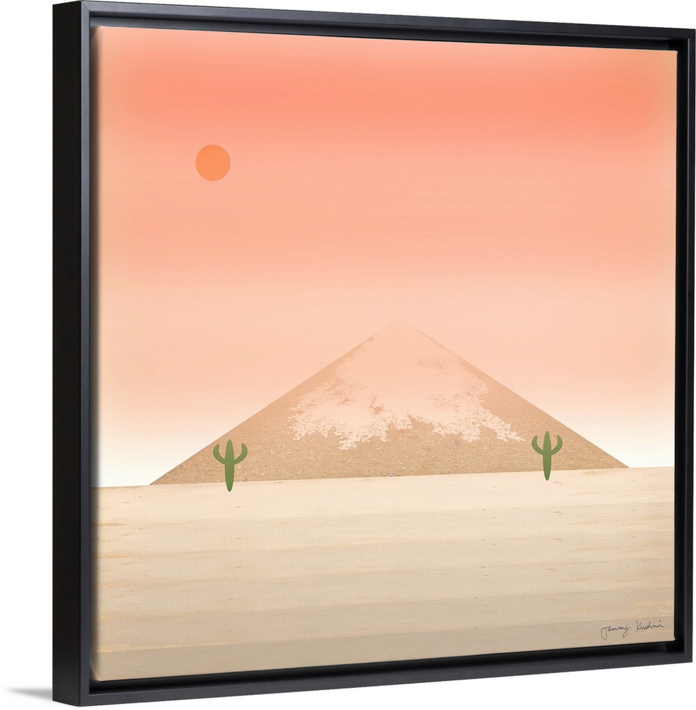 <p>Square decorative design of two green cactus next to a mountain with a sky in shades of pink.</p>