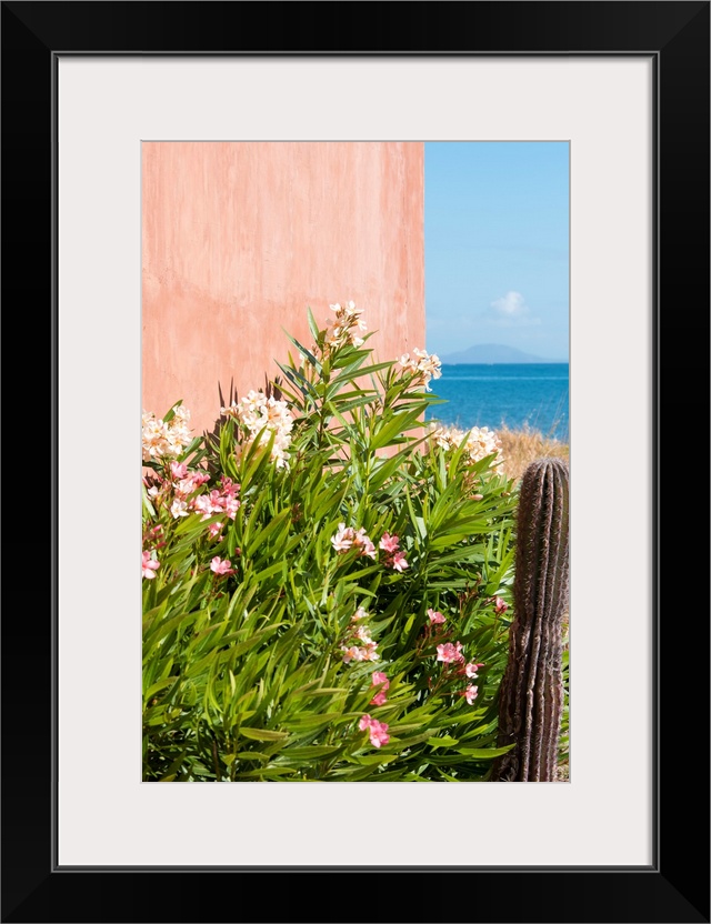 <p>Mexico, Baja California Sur. Loreto Bay. Cactus, flowering plants, Isla Coronado horizon in Sea of Cortez.</p>