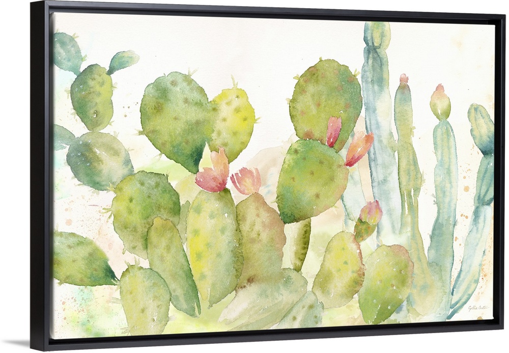 <p>A horizontal decorative watercolor painting of a group of cactus in a garden.</p>