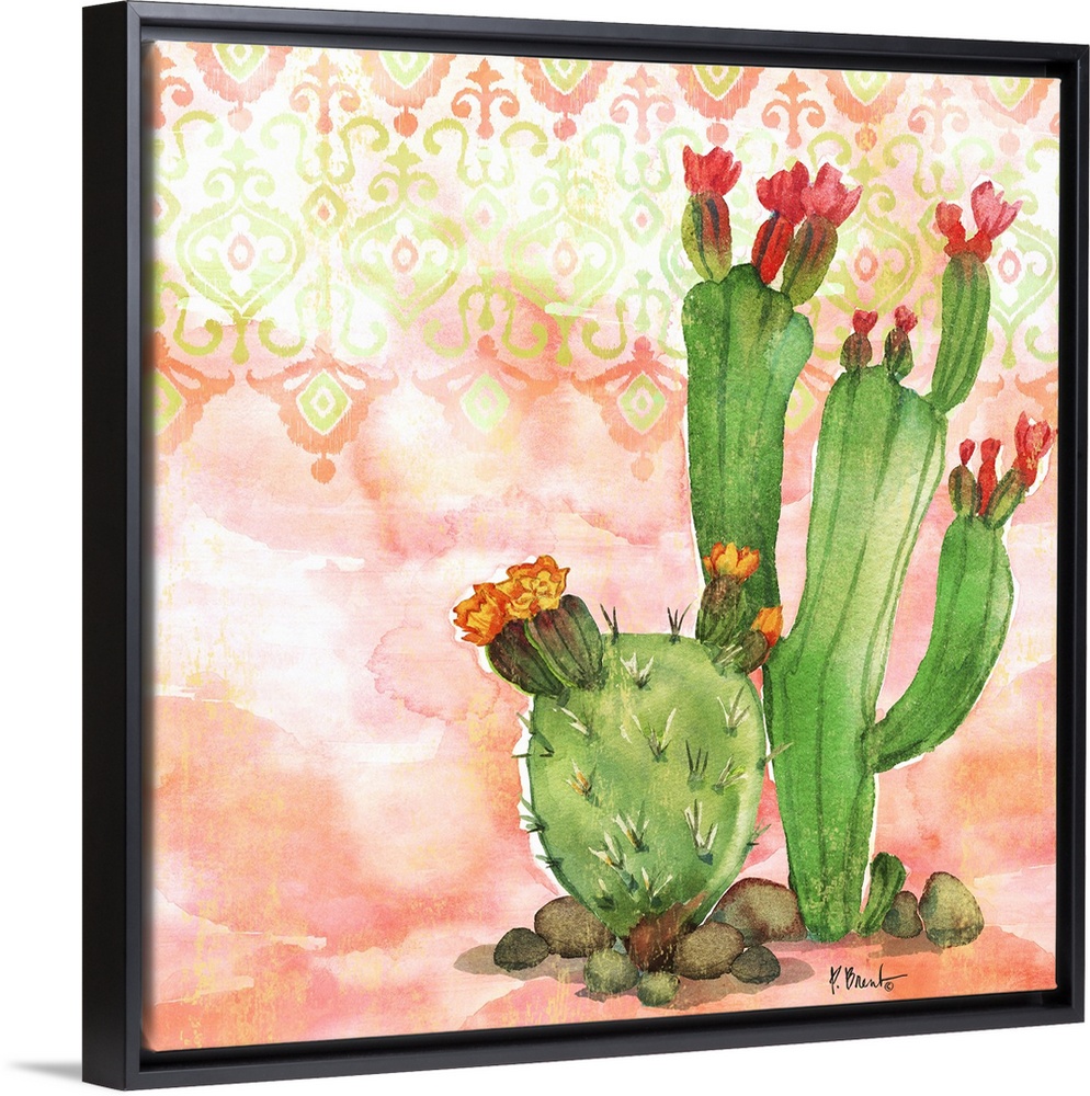 <p>Square watercolor painting of cacti on a light coral and green patterned background.</p>