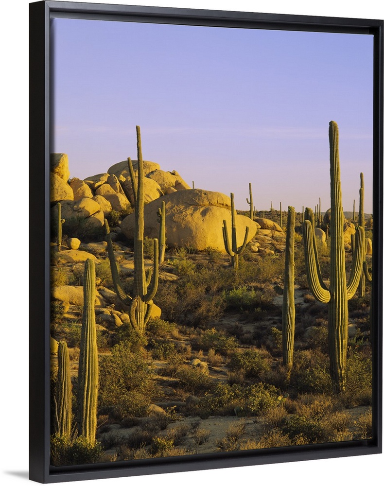 <p>Photograph of desert covered in cacti and large rocks under a clear sky.</p>