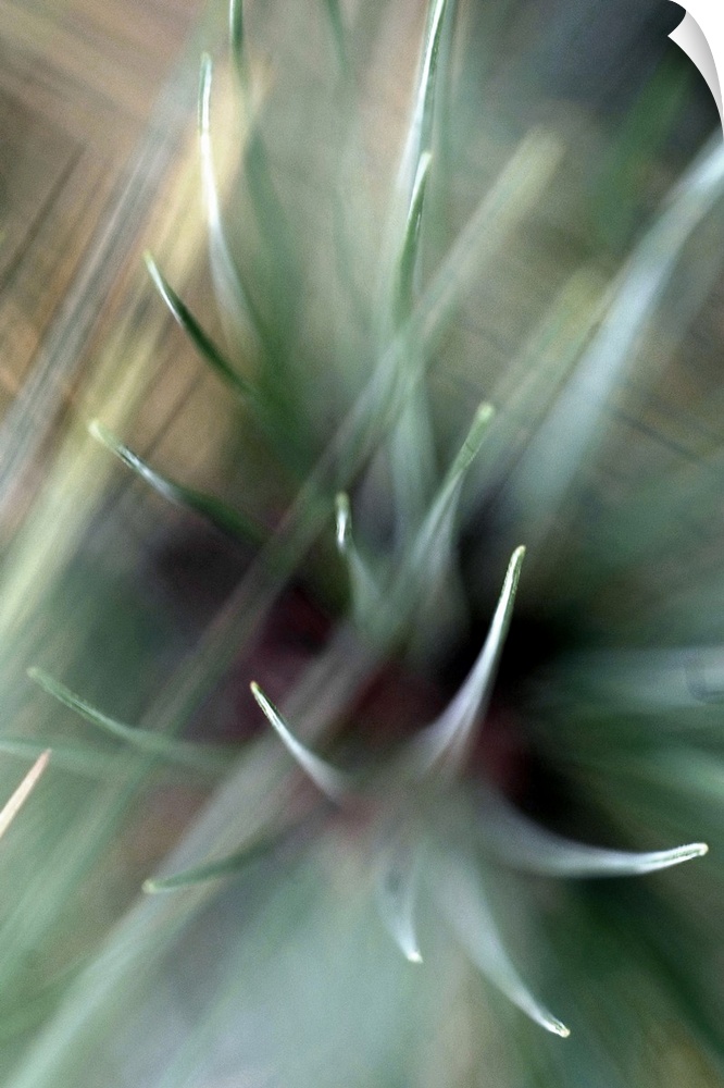 <p>Large, close up, vertical photograph of cactus spines with blurred lines of light moving through them.</p>