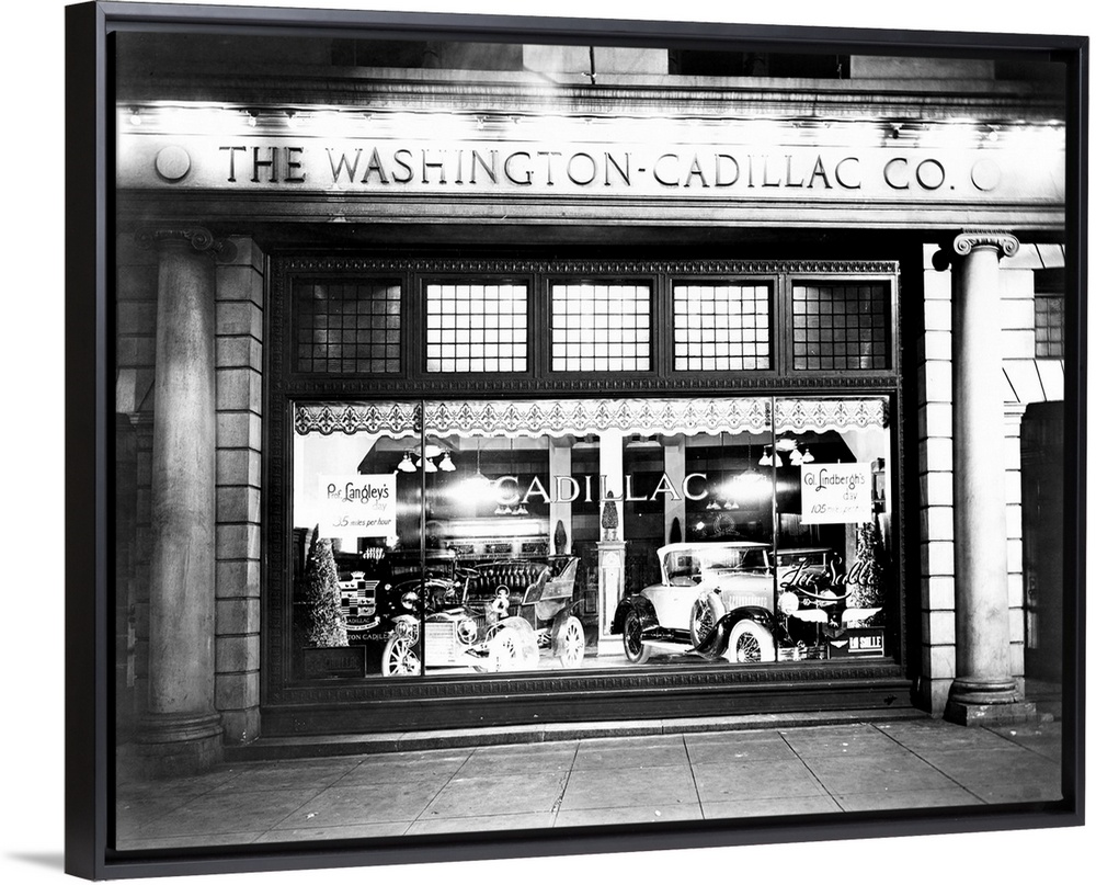 <p>Cadillac automobiles in a store window in Washington, D.C., 1927.</p>