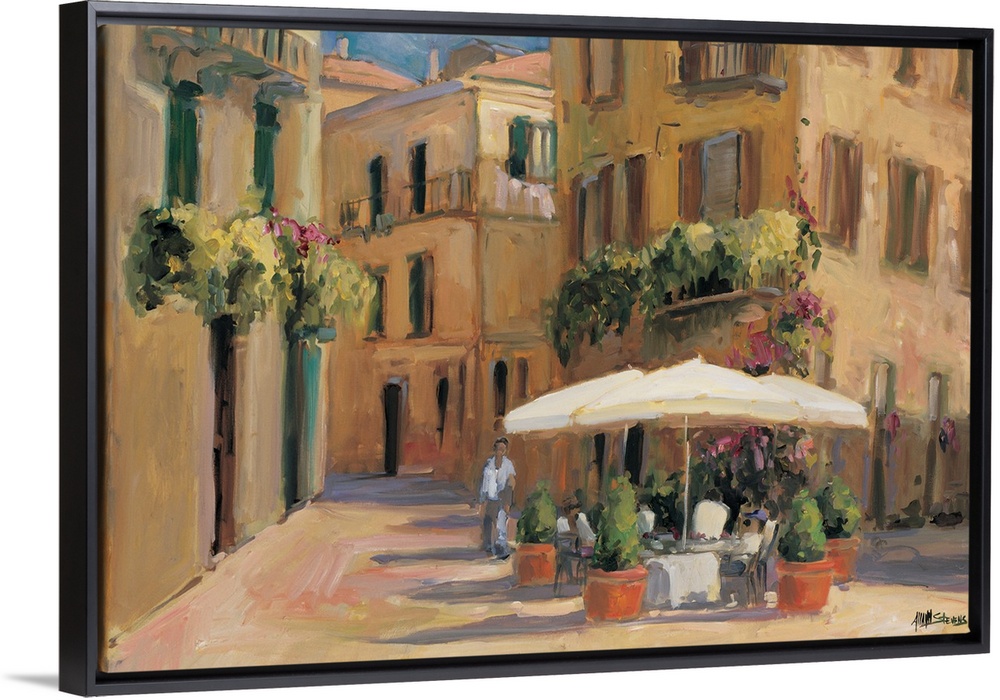<p>Fine art oil painting landscape of a sunlit outdoor cafe in Bordeaux, France by Allayn Stevens.</p>