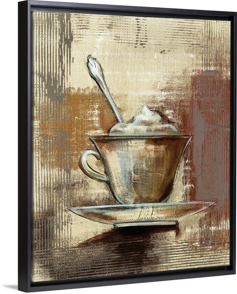 <p>Contemporary painting of a cup of coffee with whipped cream on top on a textured neutral colored background.</p>