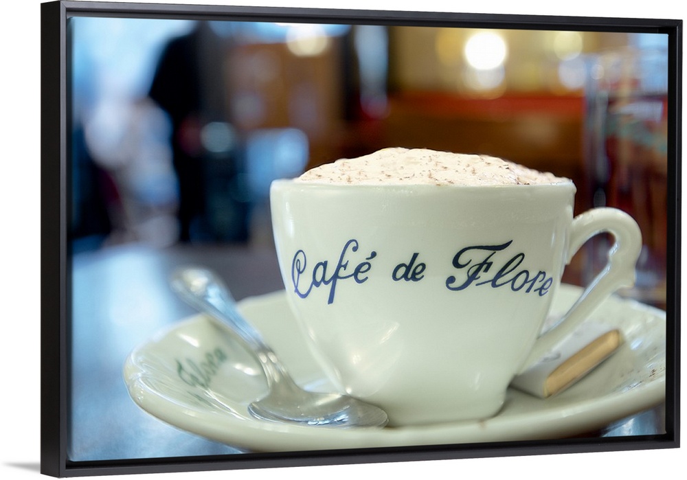 <p>A close up photograph of a cup of coffee from Cafe de Flore in Paris.</p>