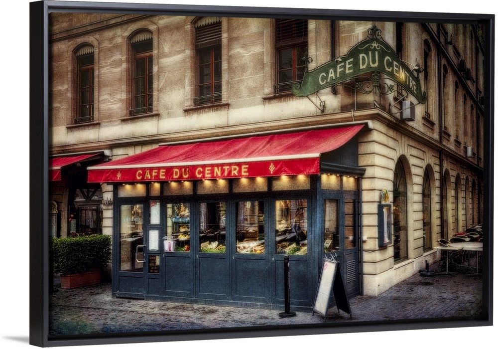<p>Red awning over the Cafe du Centre at a street corner in Geneva, Switzerland.</p>