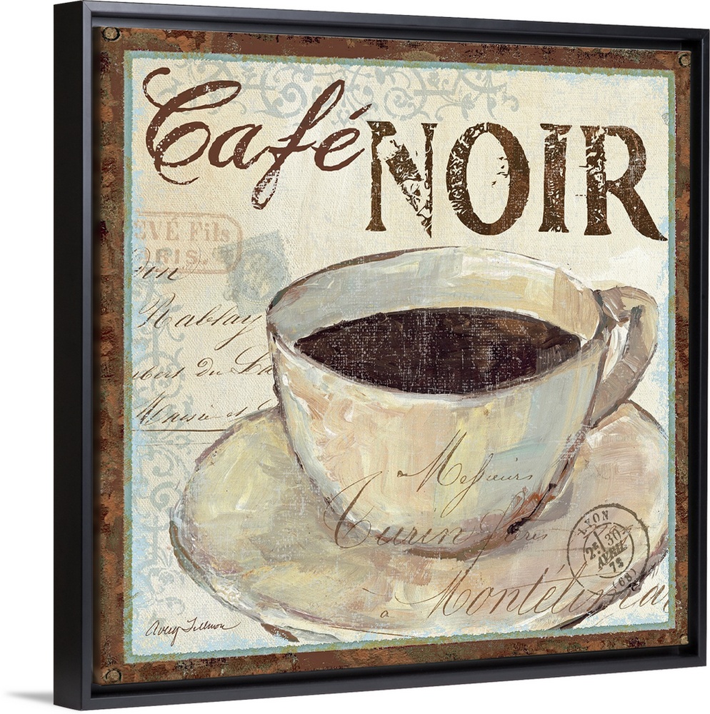 <p>Big, square home art docor of a cup of coffee on a saucer, with the text "Cafo NOIR" above it, in a decorative font. Random script text and scrolling patterns surround the image.</p>