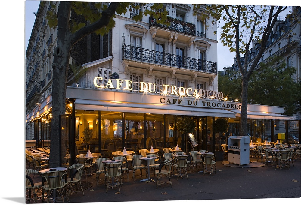 <p>A photograph at dusk of the Cafe Du Trocadero in Paris, France.</p>