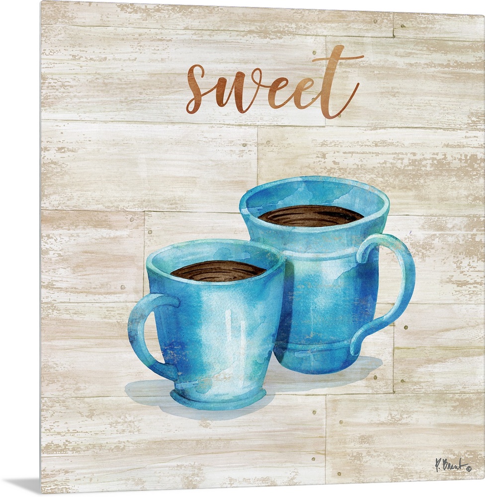 <p>Square decor with two mugs of coffee on a faux wood background with "sweet" written at the top.</p>
