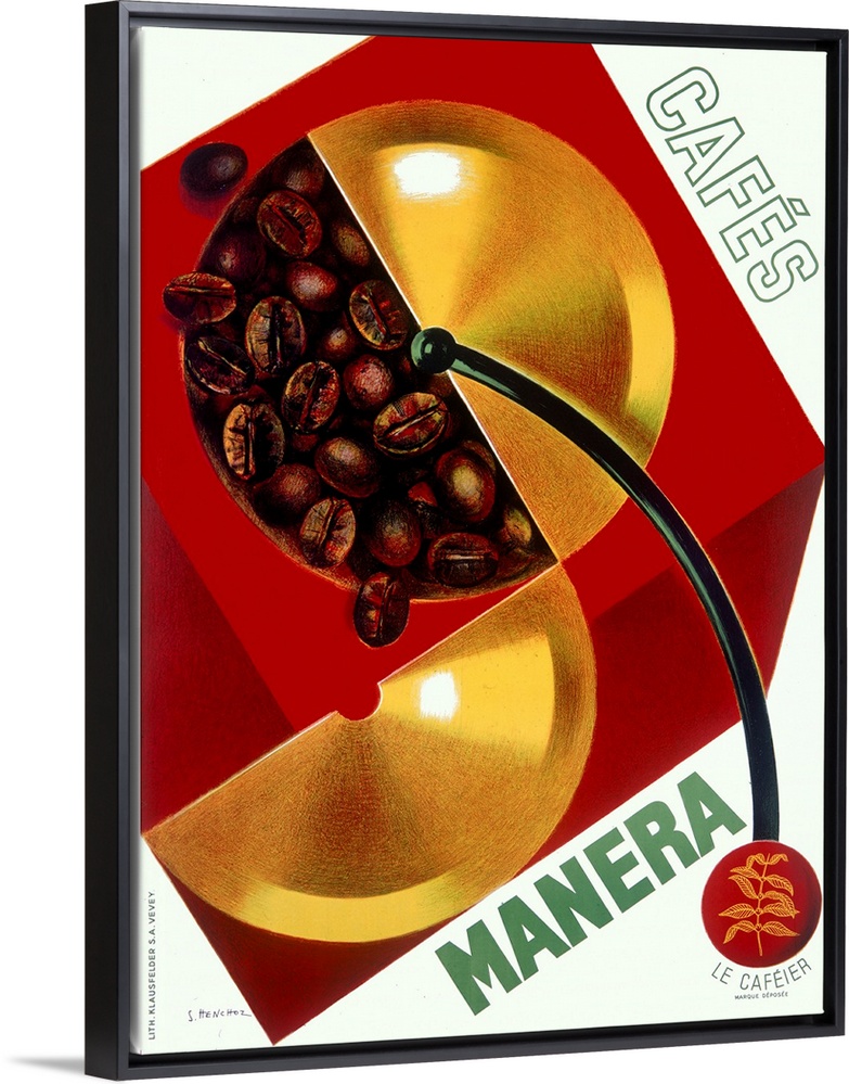 <p>Oversized, vertical, vintage advertisement wall hanging for Cafo Manera of coffee beans in a grinder on a white background.</p>