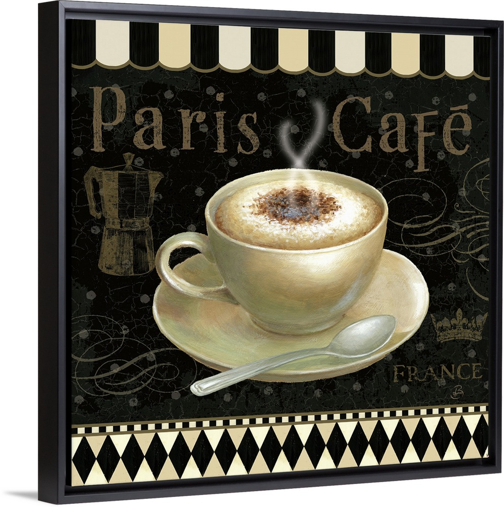 <p>Design featuring a steaming cup of mocha on a saucer with a spoon and a decorative black and white border.</p>