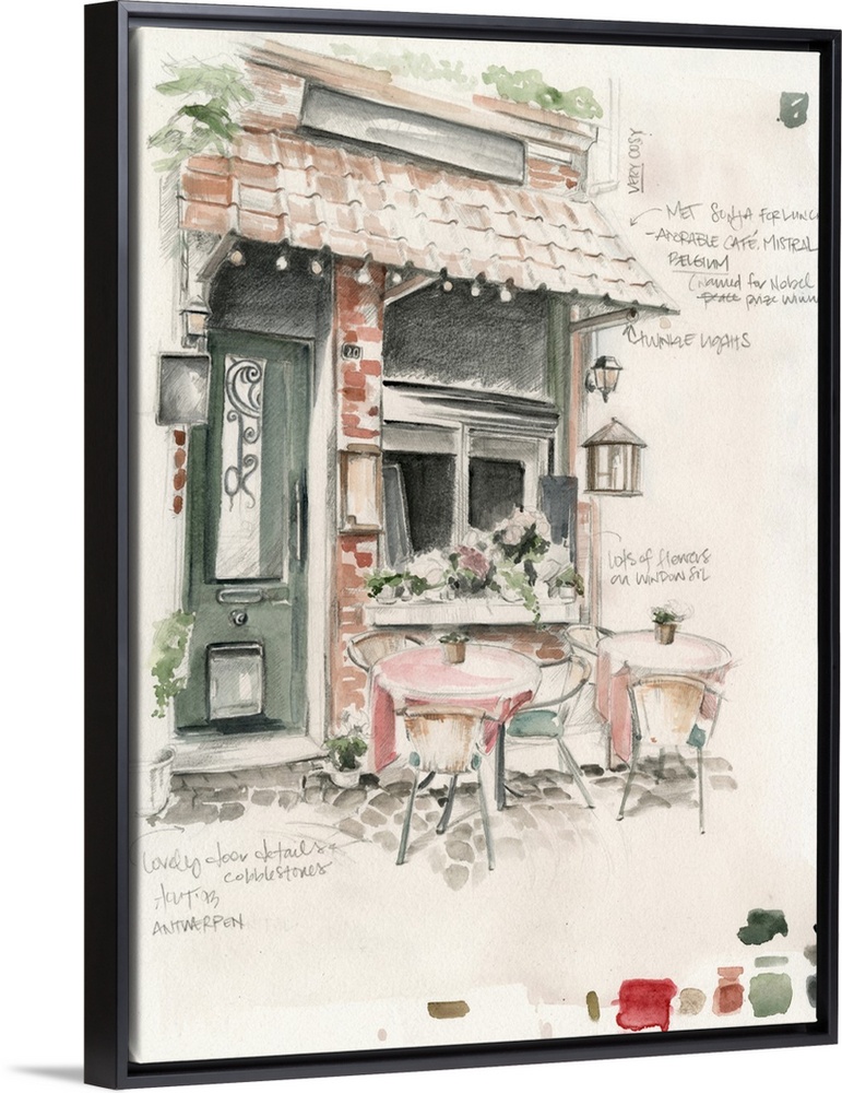 <p>Watercolor painting of the outside of a restaurant with swatches and notes from the artist on the edges.</p>