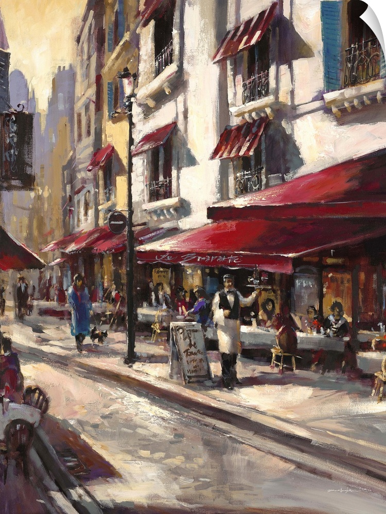 <p>Contemporary painting of a city street with a waiter standing outside a cafe.</p>