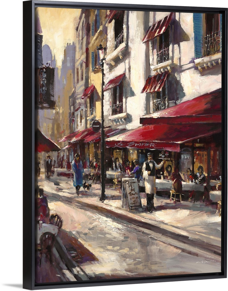 <p>Contemporary painting of a city street with a waiter standing outside a cafe.</p>