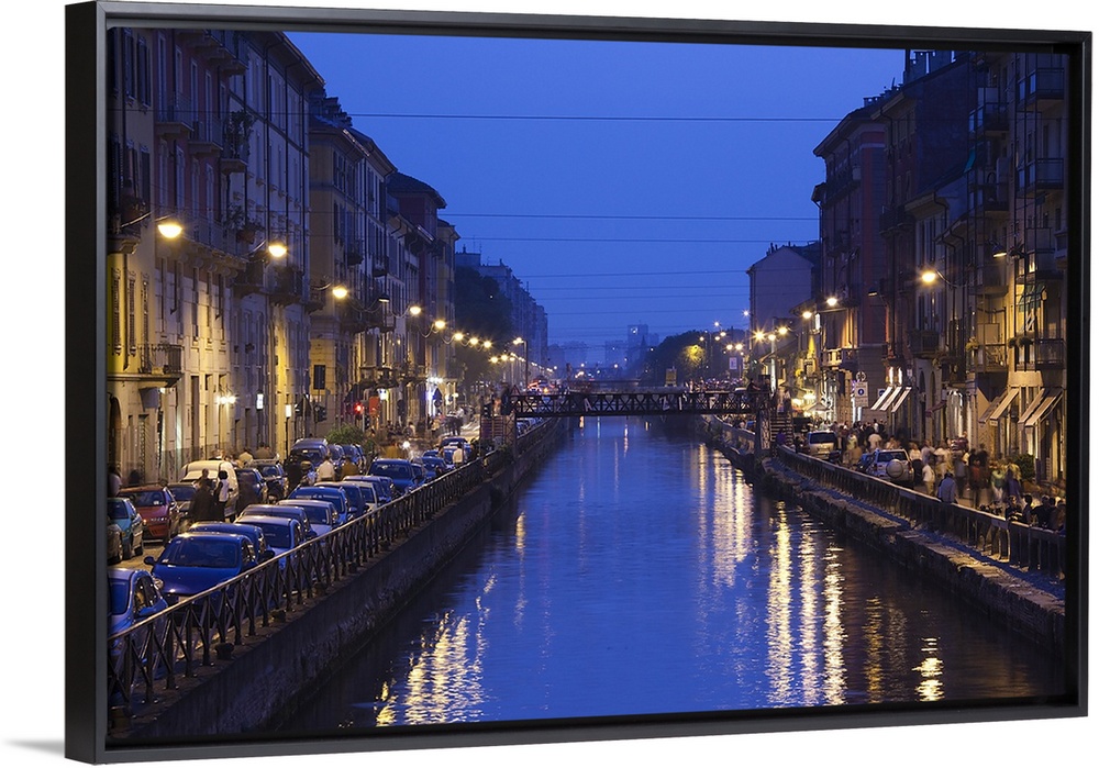 <p>Landscape photograph on giant wall hanging, looking down a canal that is lit from both sides, as it's surrounded by cafes and restaurants in Naviglio Grande, Milan, Lombardy, Italy.</p>