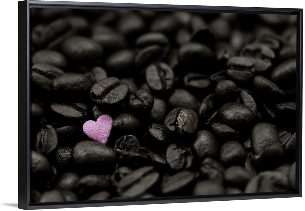 <p>Close-up photograph of dark coffee beans and a single pink heart.</p>