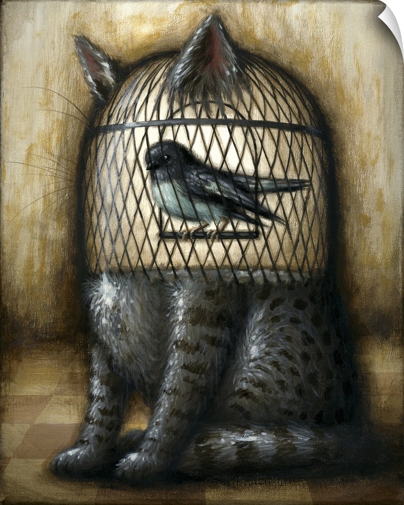 <p>Surrealist painting of a cat with the top half of the body a cage containing a bird.</p>