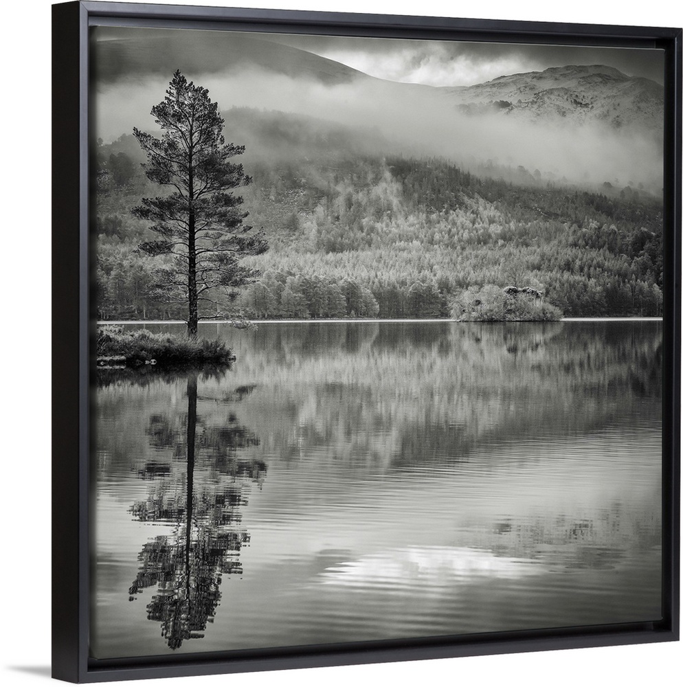 <p>A monochrome lake with beautiful reflections of the trees and hills from the Scottish Cairngorm National Park, UK.</p>