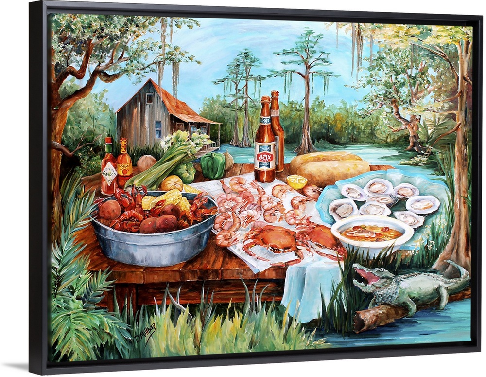 <p>A contemporary painting of a cajun meal of seafood and beer next to an alligator and house on a bayou in the background.</p>