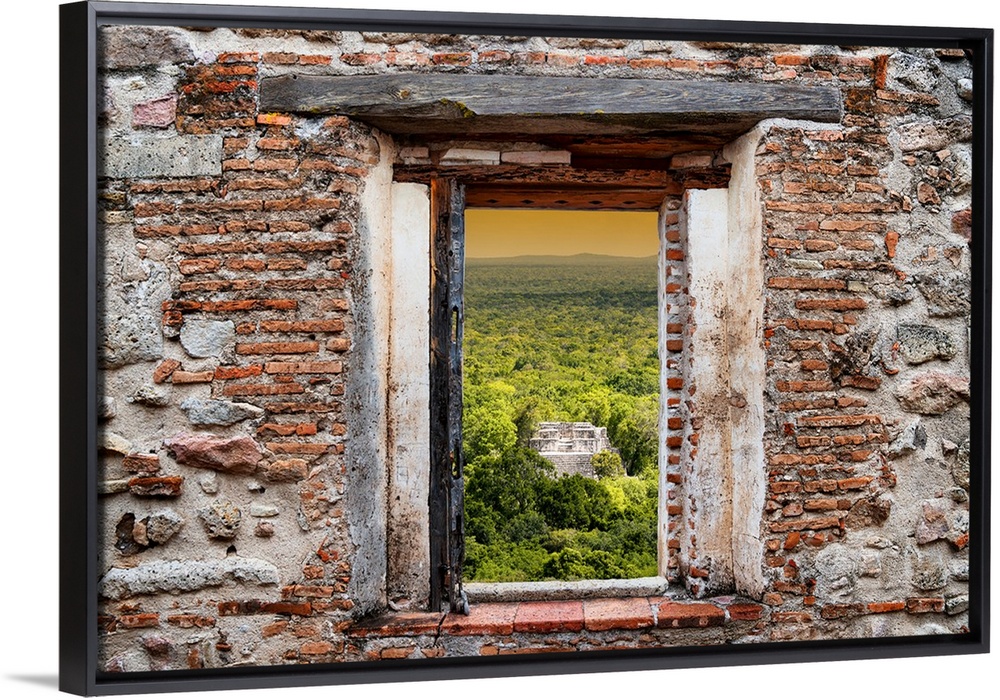 <p>View of the sunset over the ancient Mayan City of Calakmul, Mexico, framed through a stony, brick window. From the Viva Mexico Window View.</p>