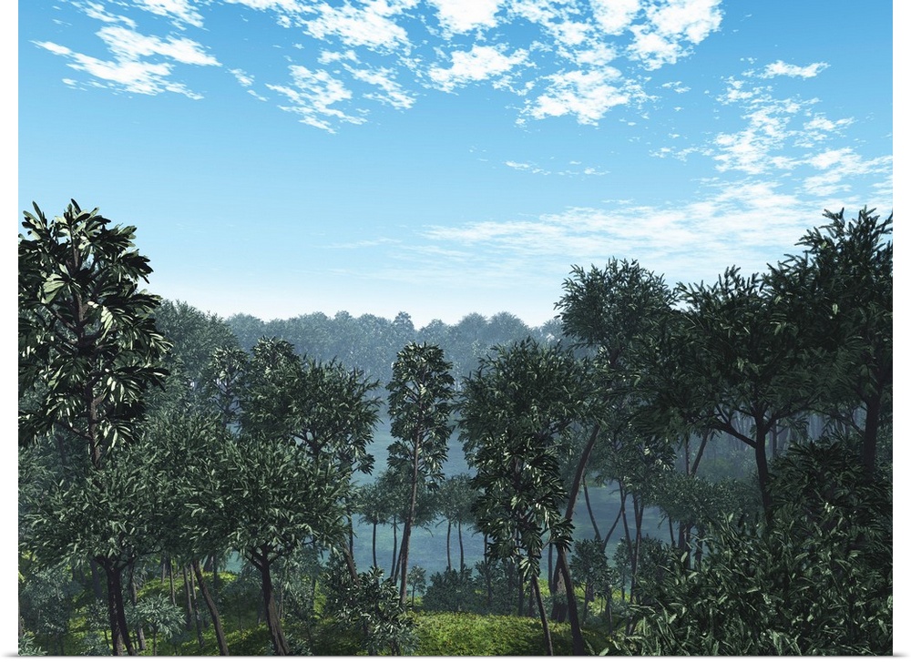 <p>Calamites and Drepanophycus populate lowlands near the brackish waters of an inland sea.</p>