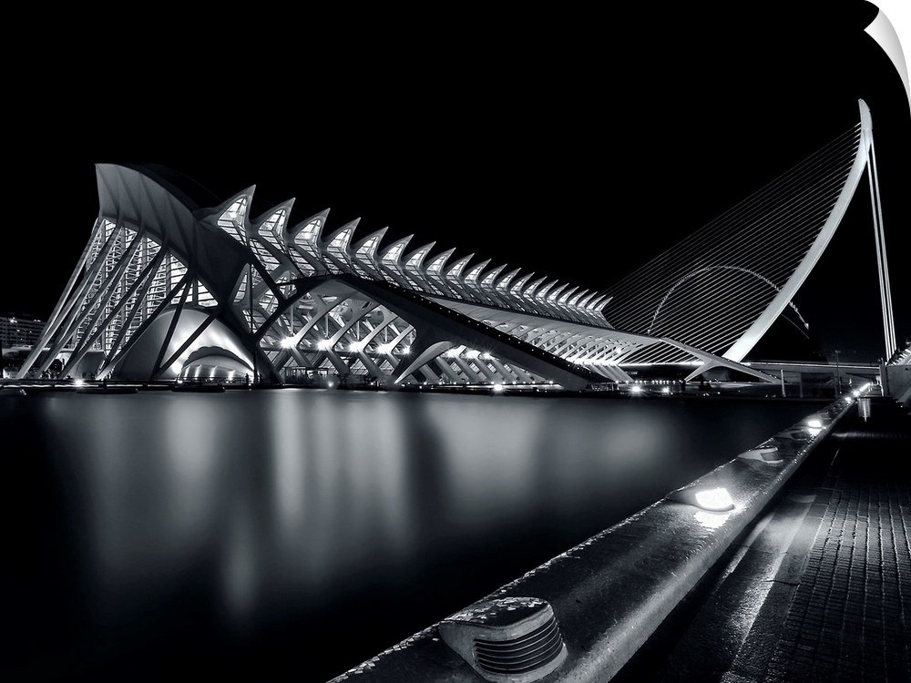 <p>High contrast black and white photo of the complex architecture of the Milwaukee Art Museum at night.</p>