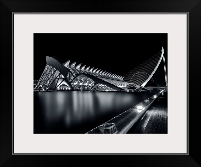 <p>High contrast black and white photo of the complex architecture of the Milwaukee Art Museum at night.</p>