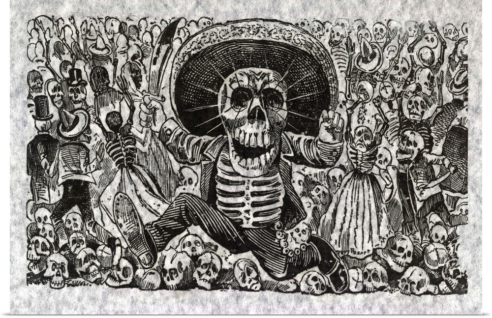 <p>Calavera Oaxaquena, published by Antonio Vanegas Arroyo, circa 1903. Print shows fierce calavera brandishing knife with a crowd of calaveras behind him. 21.3 x 33.8 cm.</p>