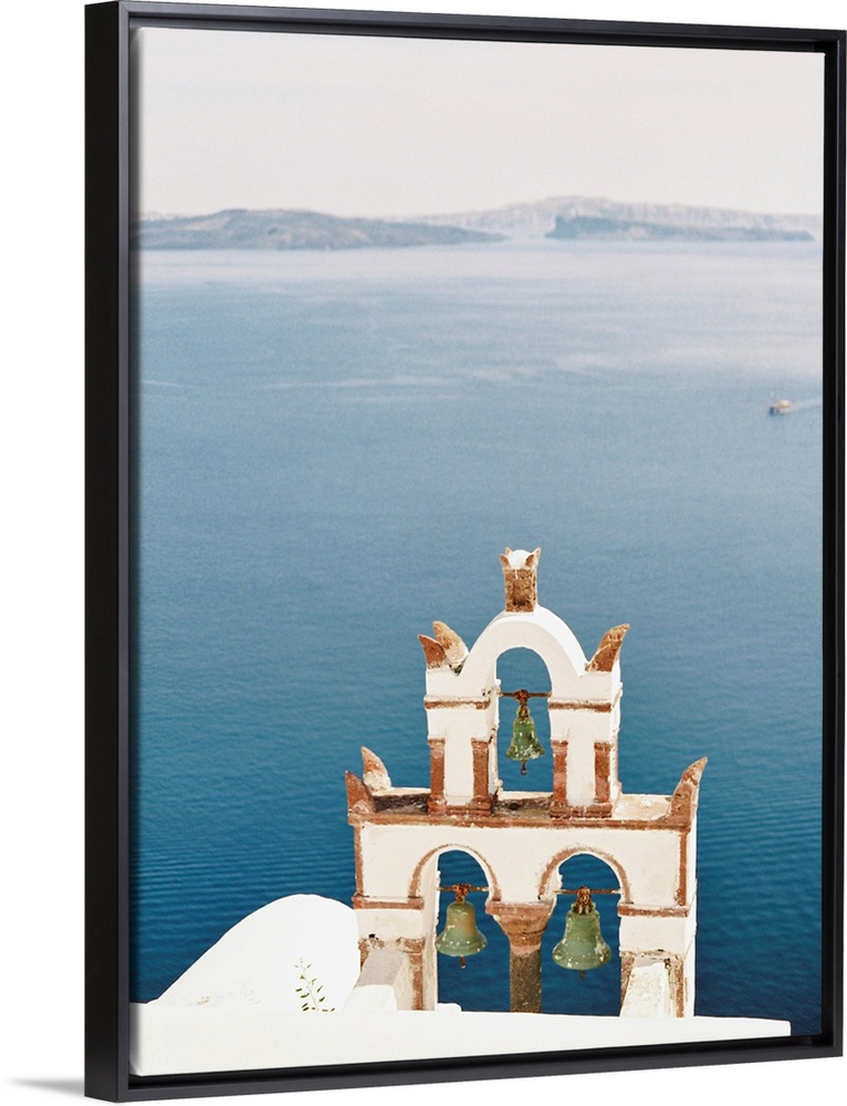 <p>Photograph of church bell towers overlooking the ocean in the Greek city of Oia, Santorini.</p>