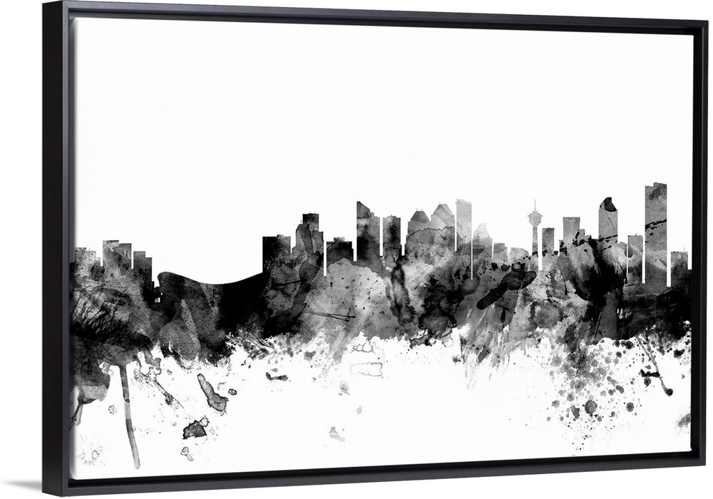 <p>Contemporary artwork of the Calgary city skyline in black watercolor paint splashes.</p>