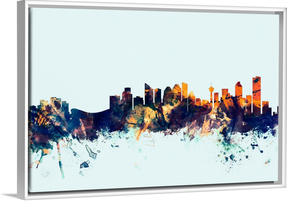 <p>Dark watercolor silhouette of the Calgary city skyline against a light blue background.</p>