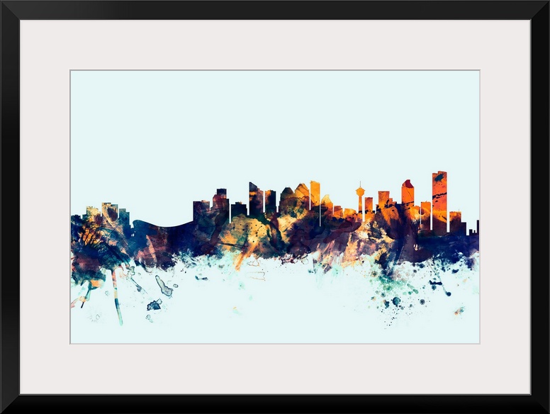 <p>Dark watercolor silhouette of the Calgary city skyline against a light blue background.</p>
