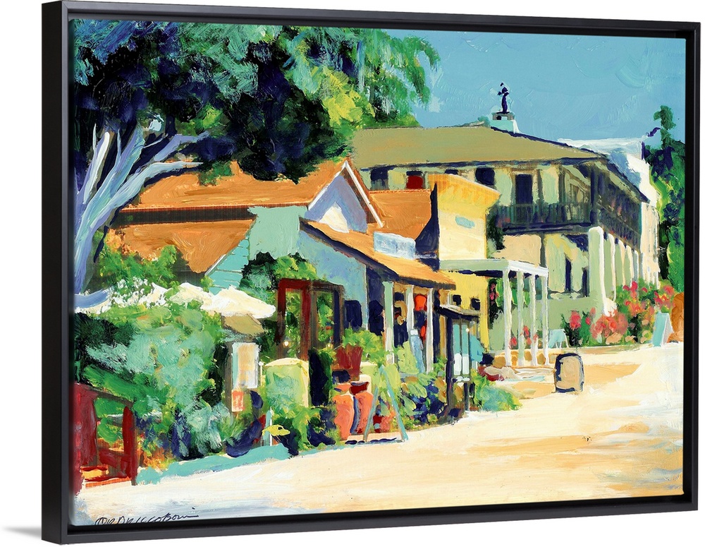 <p>Calhoun Street San Diego, painting on canvas by RD Riccoboni. Historic buildings line the street where California and the western United States began. The large house in the background is Casa De Bandini, one of the oldest houses in California is now the Cosmopolitan Hotel and Restaurant. La Casa de Bandini was completed in 1829 and soon became the social center of Old Town. Juan Bandini held various offices during the Mexican regime. When Americans took over, he supplied them with horses and supplies from his rancho.</p>