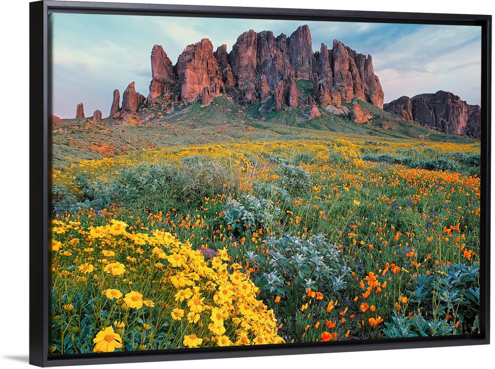 <p>Large horizontal photograph of a vast field of California Brittlebush and other wildflowers, surrounding the Superstition Mountains in the Lost Dutchman State Park, in Arizona.</p>