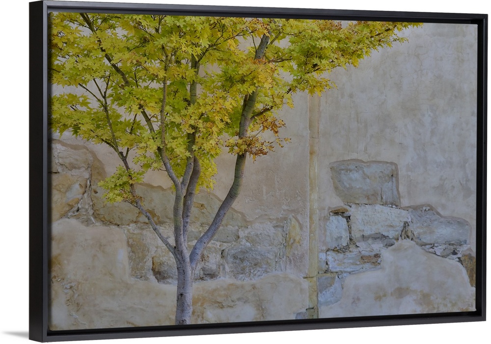 <p>USA, California, Carmel. Inside the grounds at the Carmel Mission Basilica Museum tree in fall color against stucco wall.</p>