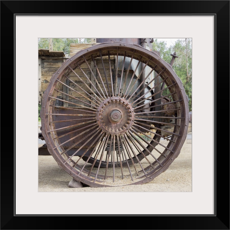 <p>California, death Valley National Park. Borax Museum, Old Dinah, 1894 steam tractor iron wheel detail.</p>
