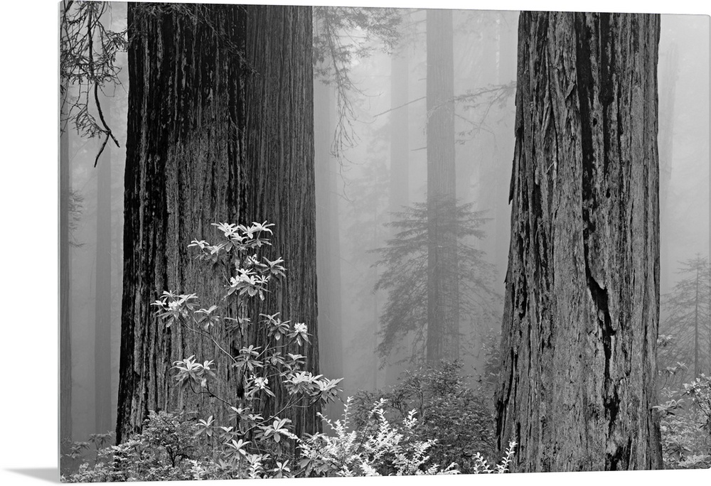 <p>California, del Norte Coast Redwoods State Park, redwood trees in fog with rhododendrons.</p>