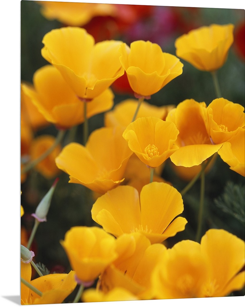 <p>Vertical, close up photograph of a grouping of golden poppies on a slightly blurred background, blooming in a field on Fidalgo Island, Washington State.</p>