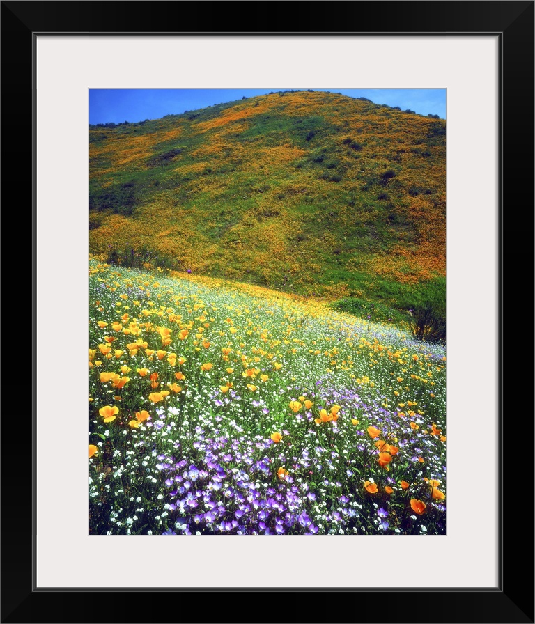 <p>USA, California, Lake Elsinore. Variety of wildflowers covering a hillside.</p>
