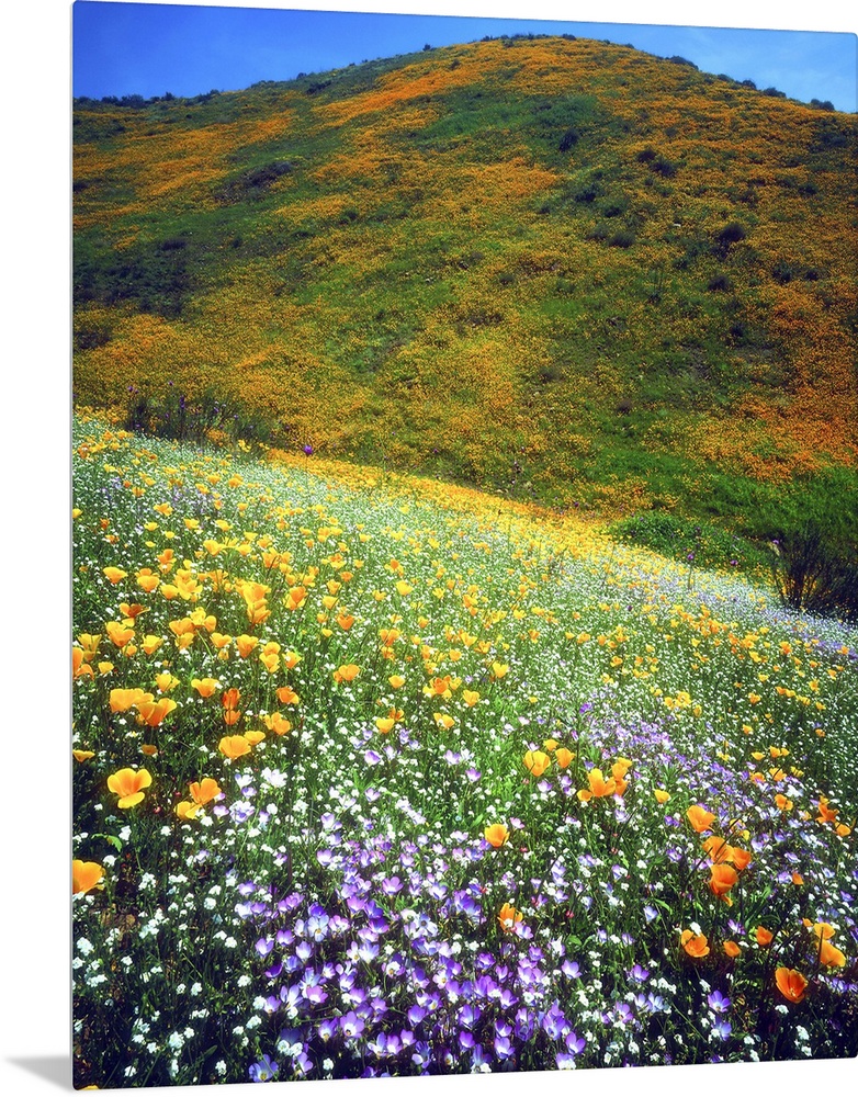 <p>USA, California, Lake Elsinore. Variety of wildflowers covering a hillside.</p>