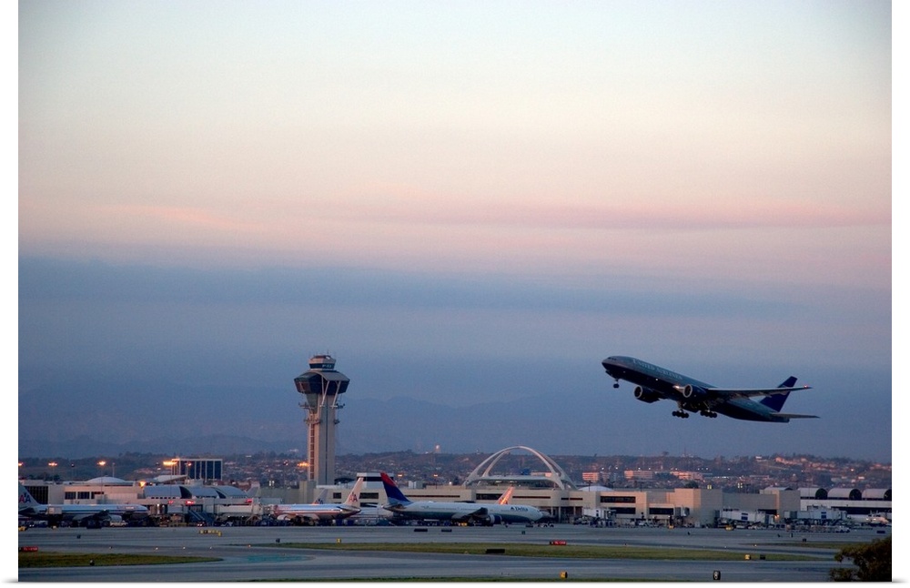 <p>Boeing 767 airplane taking off at LAX airport, Los Angeles, California at dusk.</p>