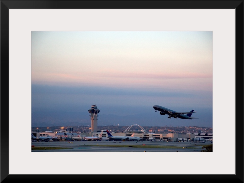 <p>Boeing 767 airplane taking off at LAX airport, Los Angeles, California at dusk.</p>
